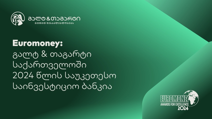 ავტორიტეტულმა ფინანსურმა გამოცემამ Euromoney-იმ გალტ & თაგარტი საქართველოში 2024 წლის საუკეთესო საინვესტიციო ბანკად დაასახელა. გალტ & თაგარტმა ჯილდო Euromoney’s Awards For Excellence-ის ყოველწლიური დაჯილდოების ფარგლებში მოიპოვა, რომელიც დღემდე სა...