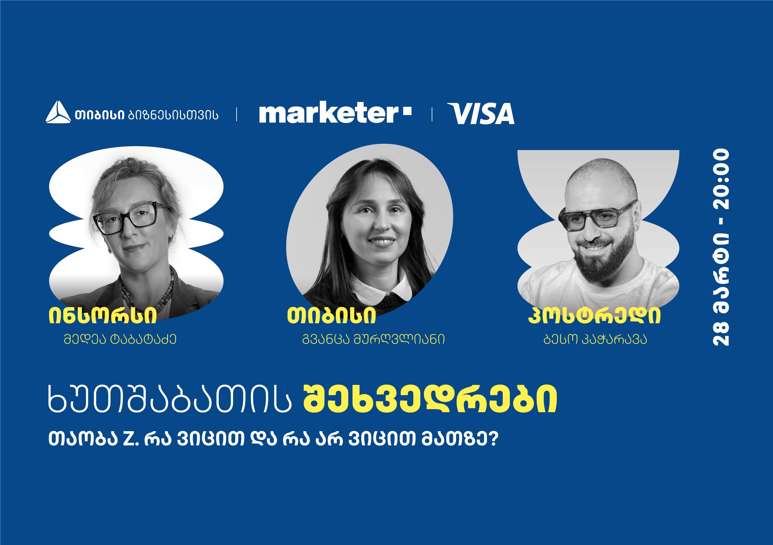 თიბისი, ტრადიციულად, აგრძელებს ბიზნესისთვის ხუთშაბათის შეხვედრებს. მორიგი შეხვედრა 28 მარტს, 20:00 საათზე “ონორეში” გაიმართება. დაინტერესებულ პირებს რიგით მეხუთე ღონისძიებაზე თიბისი ბიზნესისთვის ახალი თემით უბრუნდება – თაობა Z რა ვიცით და რა არ ...