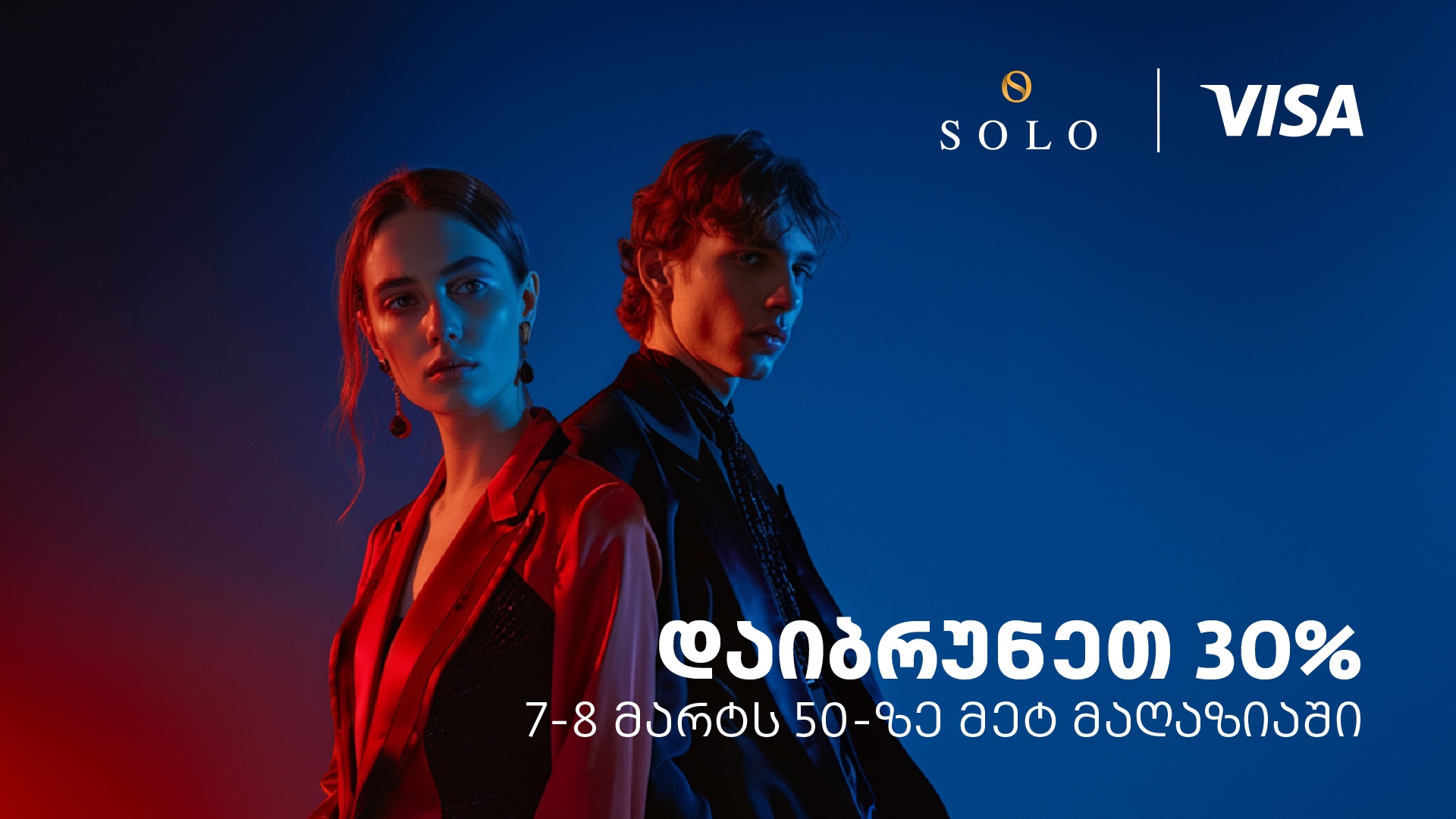 SOLO მომხმარებლებს 7 და 8 მარტს შესაძლებლობა აქვთ ისარგებლონ ქეშბექით 50-ზე მეტ ტანსაცმლისა და ფეხსაცმლის მაღაზიაში. SOLO Visa ბარათით გადახდის შემთხვევაში, მომხმარებლებს ანგარიშზე გადახდილი თანხის 30% (ჯამურად მაქს. 250 ლარი) დაუბრუნდებათ. ა...