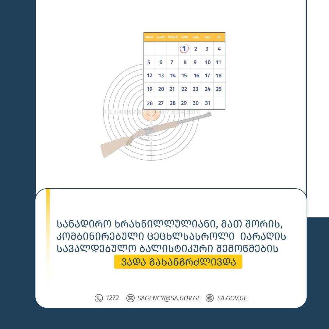 სანადირო ხრახნილლულიანი, მათ შორის, კომბინირებული ცეცხლსასროლი იარაღის სავალდებულო ბალისტიკური შემოწმების ვადა გახანგრძლივდა და განისაზღვრა 2024 წლის 1 აგვისტო. იარაღის მესაკუთრე ვალდებულია ბალისტიკური შემოწმების მიზნით მომსახურების სააგენტოში წა...