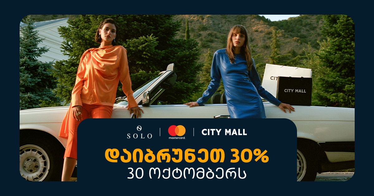 სითი მოლის დაბადების დღესთან დაკავშირებით, 30 ოქტომბერს SOLO მომხმარებლებს შესაძლებლობას აძლევს, ისარგებლონ 30%-იანი ქეშბექით სითი მოლი საბურთალოსა და სითი მოლი გლდანის 120-ზე მეტ მაღაზიაში. ქეშბექი მოქმედებს SOLO Mastercard World Elite ბარათით საქ...