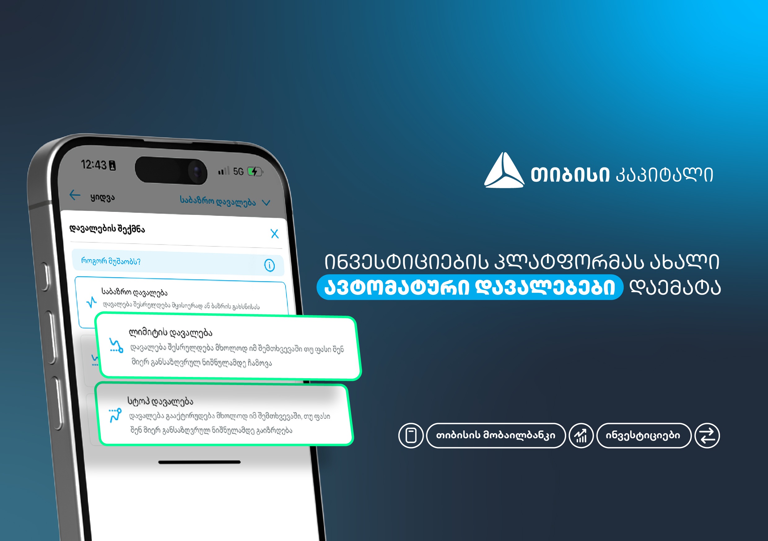 თიბისის მობაილბანკის ინვესტიციების პლატფორმას ლიმიტ და სტოპ დავალებები დაემატა. ახლა უკვე შეგიძლია აქციები შენთვის სასურველ ფასად იყიდო ან გაყიდო - ბაზარზე მუდმივი დაკვირვების გარეშე. ლიმიტ და სტოპ ორდერების მეშვეობით, წინასწარ შეარჩევ აქციის სასურ...