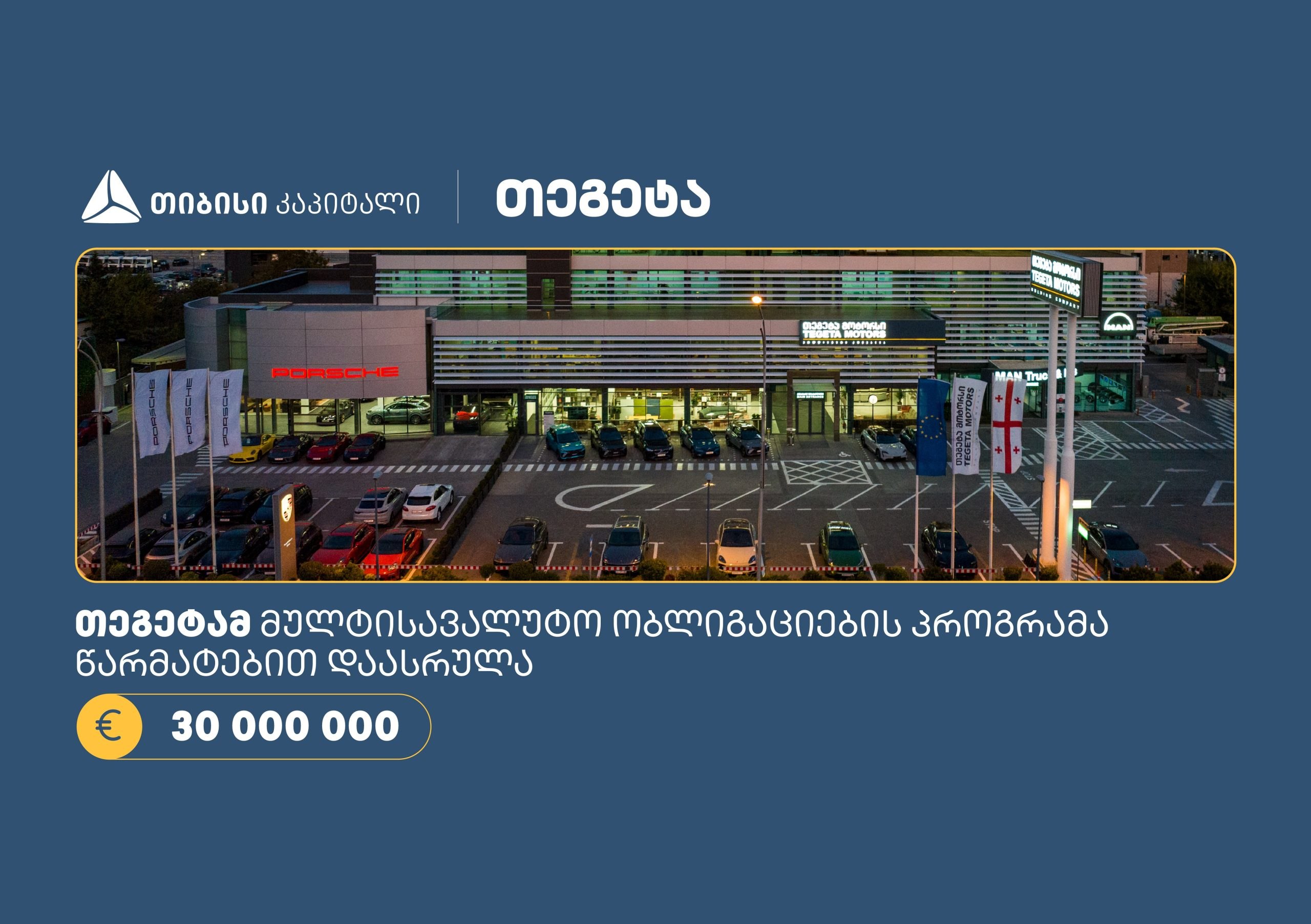 “თეგეტა ჰოლდინგმა“, თიბისი კაპიტალის მხარდაჭერით, 30 მილიონი ევროს მულტისავალუტო ობლიგაციების პროგრამის ფარგლებში, მე-4 და ბოლო ტრანშის სახით, 10 მილიონი აშშ დოლარის, 2-წლიანი, საჯარო ობლიგაციები გამოუშვა. ობლიგაციების დაშვება საქართველოს საფონდო ბირ...