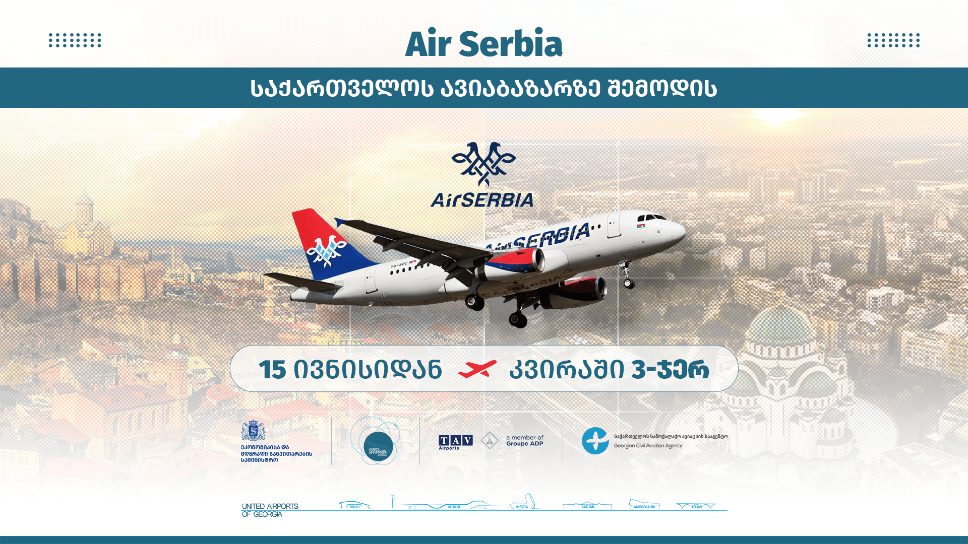 15 ივნისიდან, საქართველოს ავიაბაზარზე, ახალი ევროპული ავიაკომპანია Air Serbia შემოდის. აქტიური მოლაპარაკებები საქართველოს აეროპორტების გაერთიანებამ სერბეთის ფლაგმანთან წარმატებით დაასრულა. ავიაკომპანია ბელგრადიდან თბილისის მიმართულებით და პირიქით პი...