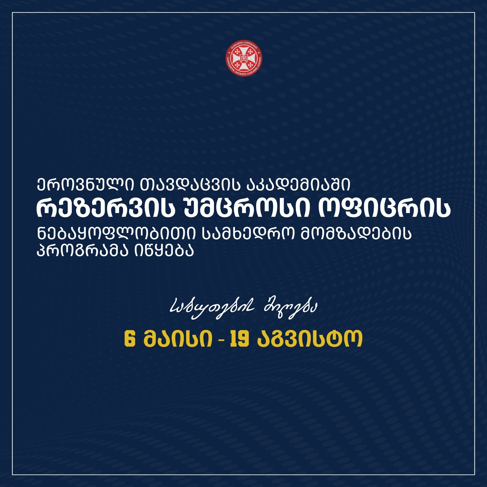 2025 წლის 6 მაისიდან 19 აგვისტოს ჩათვლით სსიპ - დავით აღმაშენებლის სახელობის საქართველოს ეროვნული თავდაცვის აკადემიაში რეზერვის უმცროსი ოფიცრის ნებაყოფლობითი სამხედრო მომზადების პროგრამაზე საბუთების მიღება იწყება. პროგრამაზე საკუთარი სურვილით, სამხე...
