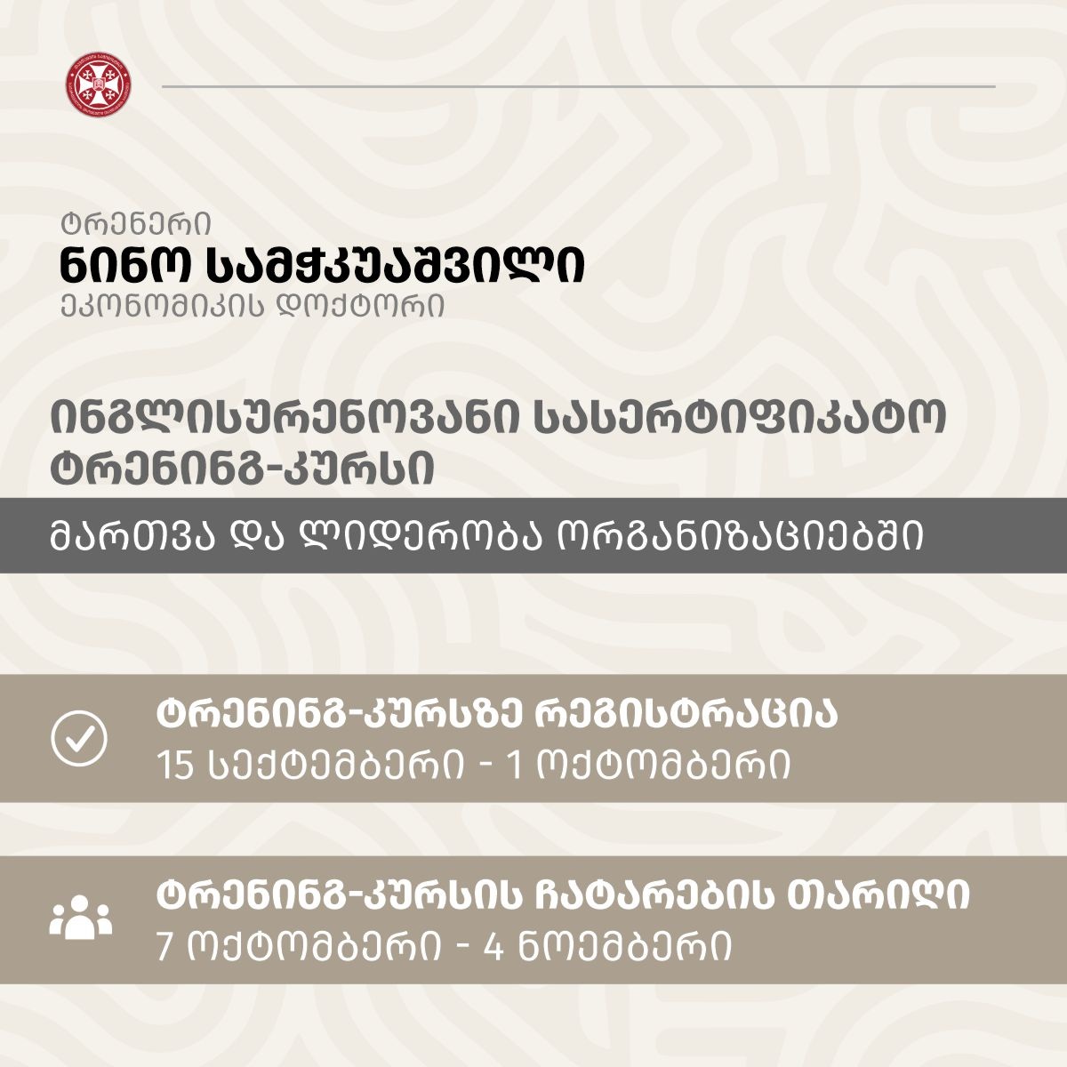 მიმდინარე წლის 7 ოქტომბრიდან ეროვნული თავდაცვის აკადემიის მიერ ორგანიზებული ფასიანი სერტიფიცირებული ტრენინგკურსი ჩატარდება. ტრენინგკურსზე რეგისტრაციის თარიღი: 15 სექტემბრიდან 1 ოქტომბრის ჩათვლით. ინგლისურენოვანი სასერტიფიკატო ტრენინგ კურსი: "მართ...