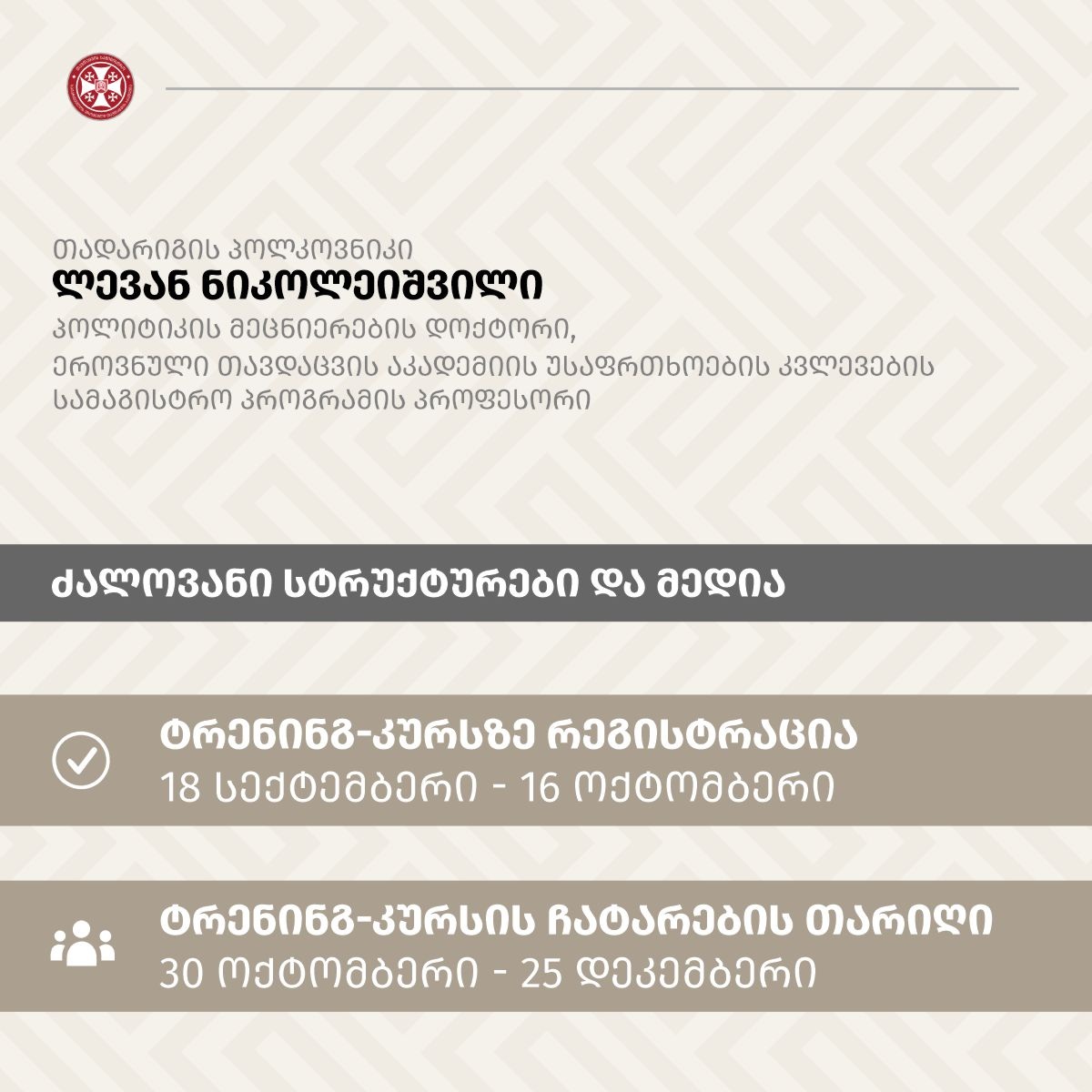 30 ოქტომბრიდან ეროვნული თავდაცვის აკადემიის მიერ ორგანიზებული ფასიანი სერტიფიცირებული ტრენინგკურსი ტარდება. ტრენინგ-კურსზე რეგისტრაციის თარიღი: 18 სექტემბრიდან 16 ოქტომბრის ჩათვლით. სასერტიფიკატო ტრენინგ კურსი: "ძალოვანი სტრუქტურები და მედია" ტრ...