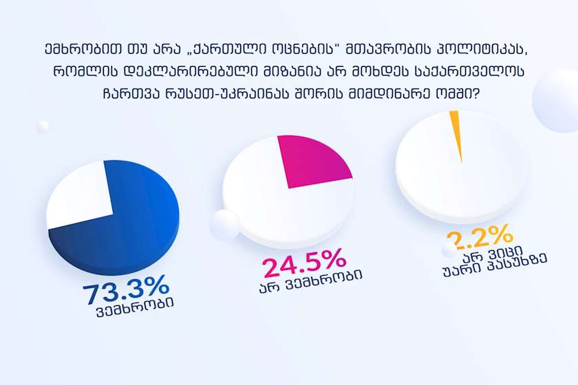 GORBI-ს კვლევის მიხედვით, შეკითხვაზე: ემხრობით თუ არა „ქართული ოცნების“ მთავრობის პოლიტიკას, რომლის დეკლარირებული მიზანია არ მოხდეს საქართველოს ჩართვა რუსეთ-უკრაინას შორის მიმდინარე ომში? პასუხები ასე გადანაწილდა: ემხრობა გამოკითხულთა 73,3%, არ ე...