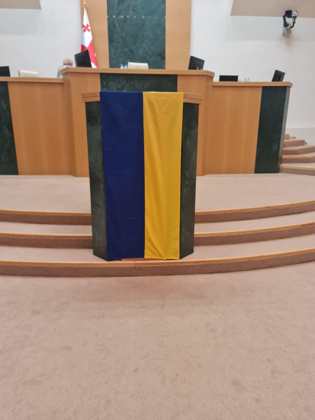 “ქართული ოცნების” საპარლამენტო უმრავლესობამ პარლამენტის სხდომათა დარბაზში, მომხსენებლის ტრიბუნაზე უკრაინის დროშა გადმოფინა. პარლამენტში დღეს პლენარული სხდომა უნდა გაიმართოს.
