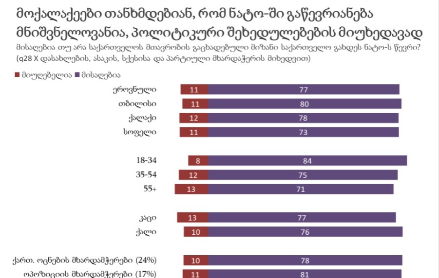NDI-ის მიერ გამოკითხული მოსახლეობის 77% ნატო-ში გაწევრიანებას მხარს უჭერს, – ამის შესახებ ეროვნულ-დემოკრატიული ინსტიტუტის მიერ დღეს გამოქვეყნებულ კვლევაშია აღნიშნული. კითხვაზე: მისაღებია თუ არა მთავრობის გაცხადებული მიზანი საქართველო გახდეს ნატო...