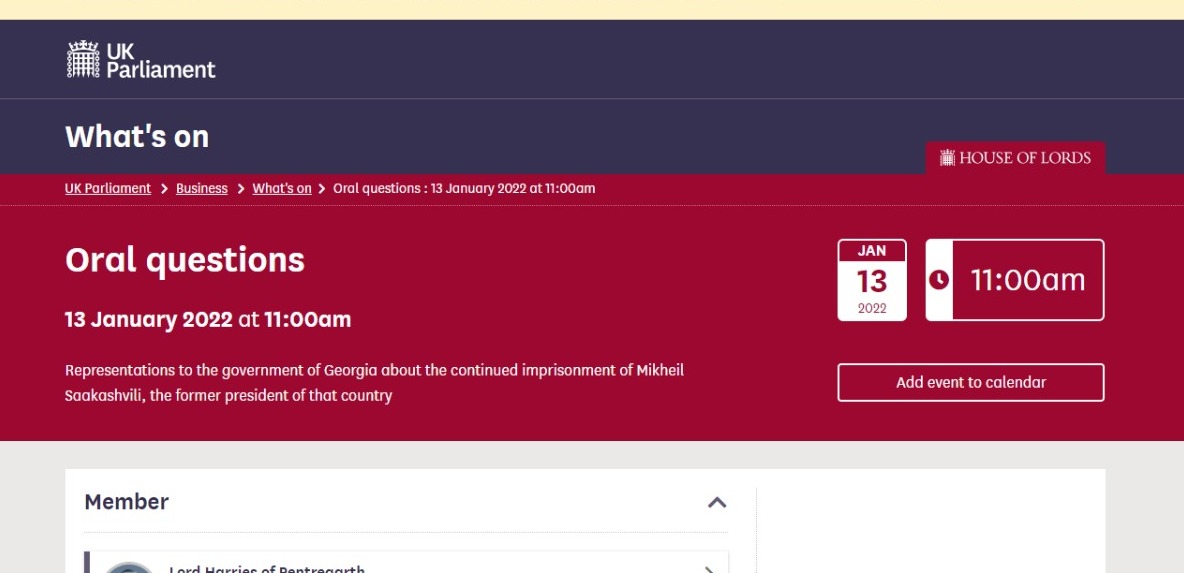 13 იანვარს ლორდთა პალატაში მიხეილ სააკაშვილის პატიმრობის შესახებ იმსჯელებენ. ინფორმაცია ლორდთა პალატის ოფიციალურ ვებგვერდზეა გამოქვეყნებული. ცნობილია, რომ დისკუსია ლოდრი ჰარისის ინიციატივით წარიმართება, – აღნიშნულის შესახებ სოციალურ ქსელში „ნაციონალუ...