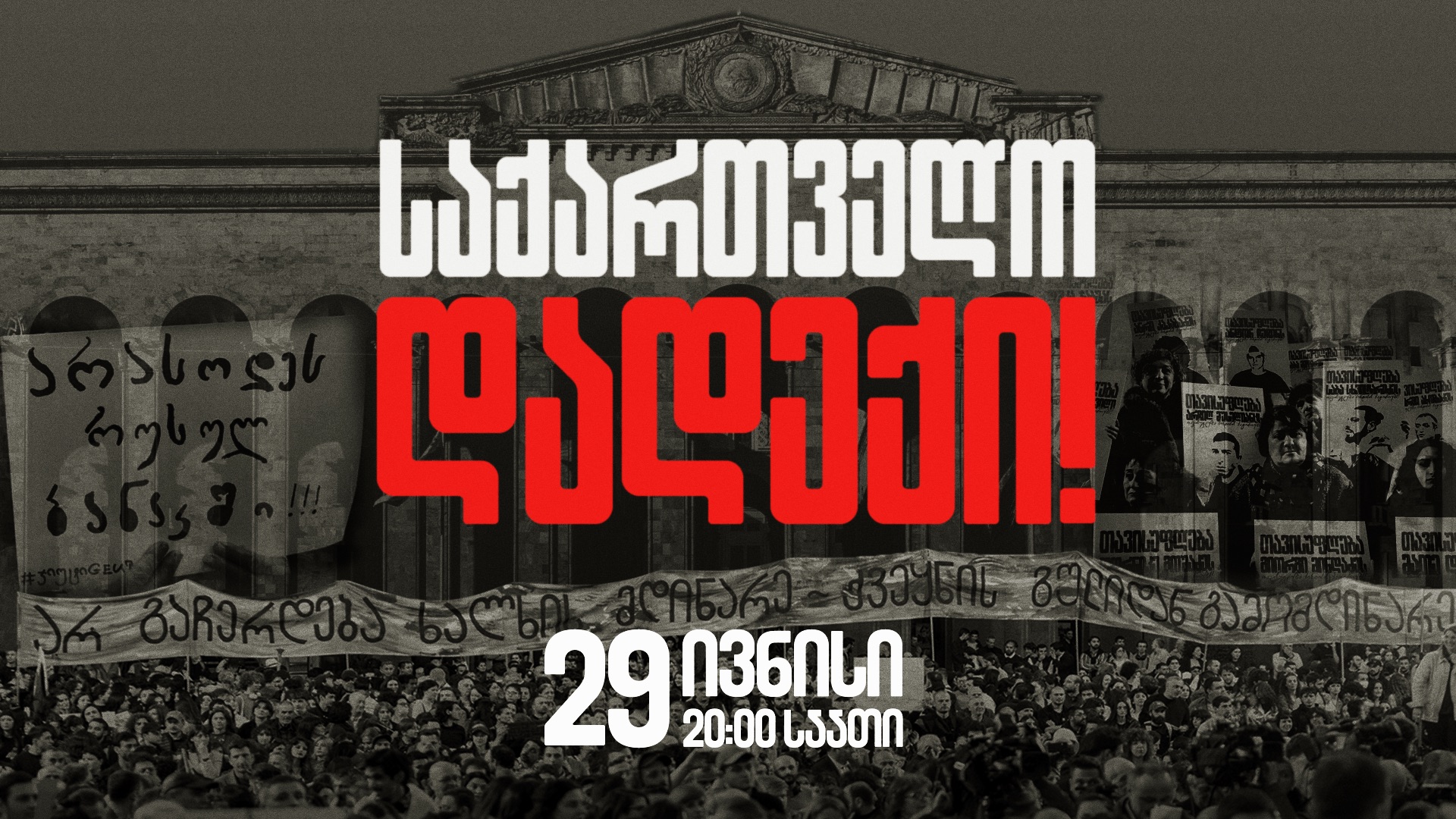 29 ივნისს, 20:00 საათზე თბილისში, რუსთაველზე აქცია "საქართველო დადექი" გაიმართება. "საქართველოს მტერი ცდილობს, თავისუფალი ქვეყანა ერთ დიდ საპყრობილედ გადააქციოს. უკვე ციხეში არიან პროდასავლური პარტიების პოლიტიკური ლიდერები, ჟურნალისტები, აქტივისტები...