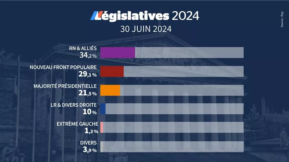 საფრანგეთში საპარლამენტო არჩევნების პირველ ტურში კენჭისყრა დასრულდა. ეგზიტპოლის შედეგების საფუძველზე, პირველ ტურში ულტრამემარჯვენე პარტია “ეროვნული გაერთიანება” იმარჯვებს. Ifop-ის შედეგებით, პარტია “ეროვნულ გაერთიანებას”, რომლის ლიდერი პრორუსი მა...