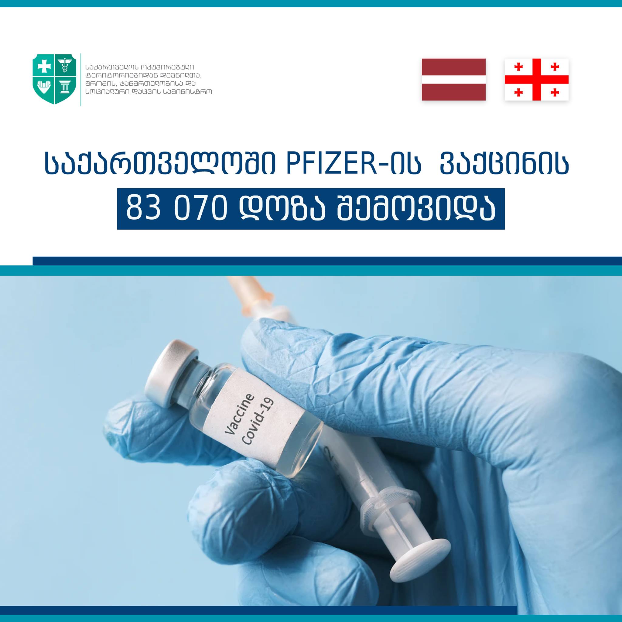 ლატვიის მთავრობამ საქართველოს დონაციის სახით 83 070 დოზა “ფაიზერის“ ვაქცინა გადმოსცა. “ფაიზერის“ ვაქცინა ჯანმრთელობის მსოფლიო ორგანიზაციის მიერაა აღიარებული. ვაქცინაციისთვის საჭირო ორი დოზა 21-28 დღის ინტერვალით კეთდება. „ფაიზერმა“ ვაქცინა გერმან...